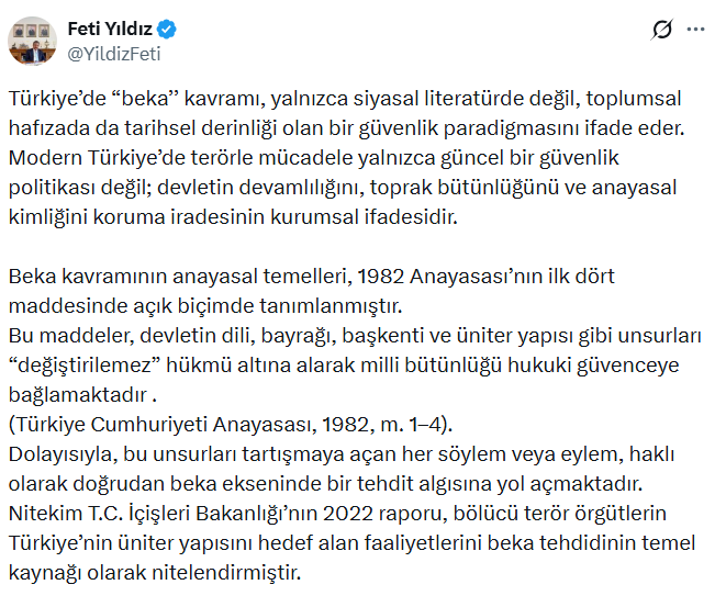 MHP Genel Başkan Yardımcısı Feti Yıldız, sosyal medya platformu X üzerinden yaptığı açıklamada, Türkiye’de “beka” kavramının yalnızca güncel bir siyasi söylem değil, anayasal temellere dayanan tarihsel ve kurumsal bir devlet refleksi olduğunu söyledi.