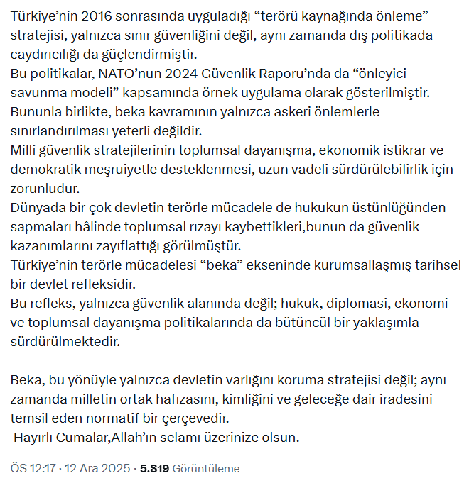 “Türkiye’de ‘beka’ kavramı, yalnızca siyasal literatürde değil, toplumsal hafızada da tarihsel derinliği olan bir güvenlik paradigmasını ifade eder. Modern Türkiye’de terörle mücadele yalnızca güncel bir güvenlik politikası değil; devletin devamlılığını, toprak bütünlüğünü ve anayasal kimliğini koruma iradesinin kurumsal ifadesidir.